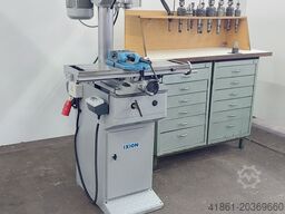- Inclus : avances automatiques, réglage en hauteur motorisé de l’unité de perçage-fraisage, divers accessoires sur établi séparé, étau machine, porte-fraises et éléments de serrage, établi