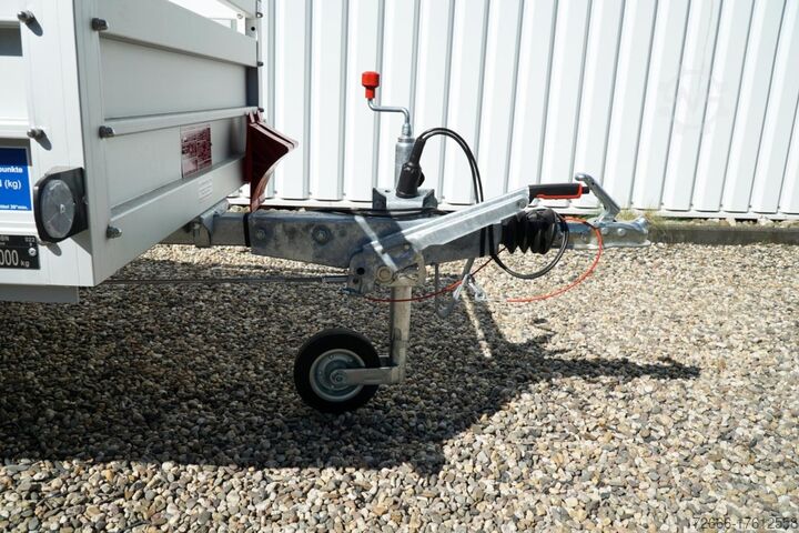 Hydraulique, marche arrière automatique, galvanisation à chaud, non freiné, * DISPONIBLE IMMÉDIATEMENT * Données techniques : - Type : Véhicule neuf - Disponibilité : immédiate ! - Contrôle technique (TÜV) : 2 ans à compter de la première immatriculation - Planche de sol : plancher intégral en aluminium ! - Poids total autorisé : 1.000 kg - Poids à vide : 160 kg - Charge utile : 840 kg - Dimensions intérieures : 205 x 105 x 45 cm (L x l x h) - Dimensions extérieures : 306 x 157 x 96 cm (L x l x h) - Hauteur du bord de chargement : 50 cm - Pneumatiques : 185/70R13 - Frein : oui - Roue jockey : oui - 100 km/h : INCLUS !! - papiers du véhicule (certificat d'immatriculation) inclus Équipement de série : - ridelles double paroi en aluminium anodisé 30 mm, 440 mm de hauteur avec cadre aluminium intégré et étriers d'arrimage sophistiqués - longs longerons (2 poutres longitudinales) - ridelle équipée d’un système d’arrimage – accessoires comme les anneaux d'arrimage peuvent être faciles à monter sans perçage - anneaux d’arrimage en inox (V2A, antirouille) - fermetures très robustes pour la ridelle arrière en inox V2A antirouille (unique) - essieu à suspension caoutchouc galvanisé à chaud, sans entretien - châssis et timon d’un fabricant reconnu ALKO - indicateur de sécurité sur l’attelage - câbles de frein avec gaine professionnelle longue durée (gaines plastiques sur le câble acier) - ailes en acier - ridelle arrière facilement amovible - prise 13 broches - feu de recul - éclairage de sécurité de grande taille - feu antibrouillard arrière intégré - éclairage encastré dans le cadre arrière - pneus équilibrés de marque en équipement de série - visserie intégrale M8 inox (V2A antirouille) - panneau de commande clair avec données principales (pression des pneus, schéma de câblage…) - homologation 100 km/h : incluse ! - frais de convoyage inclus - certificat d’immatriculation & documents COC inclus Équipement spécial inclus dans le prix : - plancher intégral aluminium - plancher aluminium complet avec surface striée, pour une durabilité quasi illimitée. Accessoires en option : - grille haute à l’avant - bâche + arceaux - supports, grilles, rallonges de ridelles, filets Véhicule neuf avec garantie et contrôle technique. Nous vous proposons volontiers une solution de financement adaptée ! Descriptions et photos protégées par droits d’auteur !! Plus de 800 remorques disponibles immédiatement chez nous ! Nous sommes depuis plus de 30 ans distributeur agréé et atelier pour Brian James / Humbaur / Hapert / Unsinn / Cheval Liberté / Koch / Debon / Stedele / TPV / Tohaco / Vezeko / Variant / Vlemmix – Atelier de réparation – Livraison possible dans toute l’Allemagne avec supplément ! Anhänger Zentrum BAUMANN GmbH Dinxperloer Str. 389 46399 Bocholt – sous réserve d’erreur, omission et vente préalable –